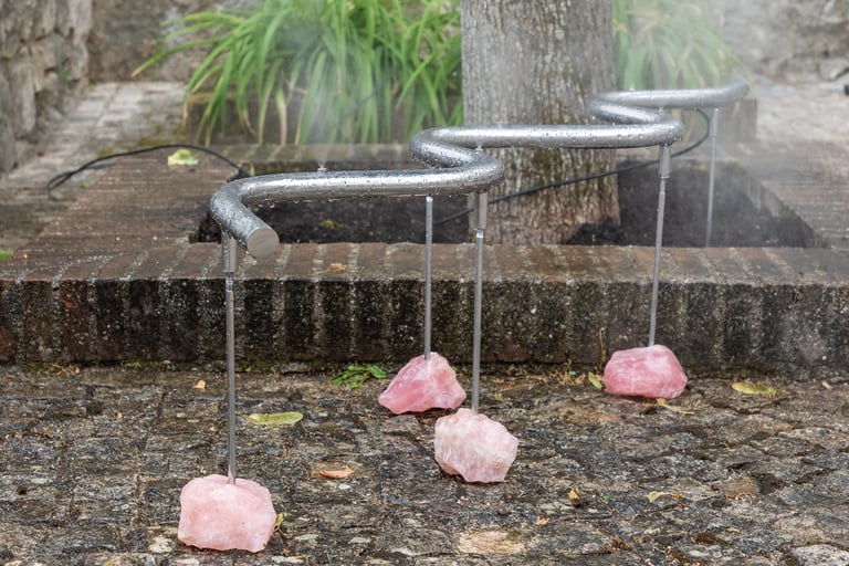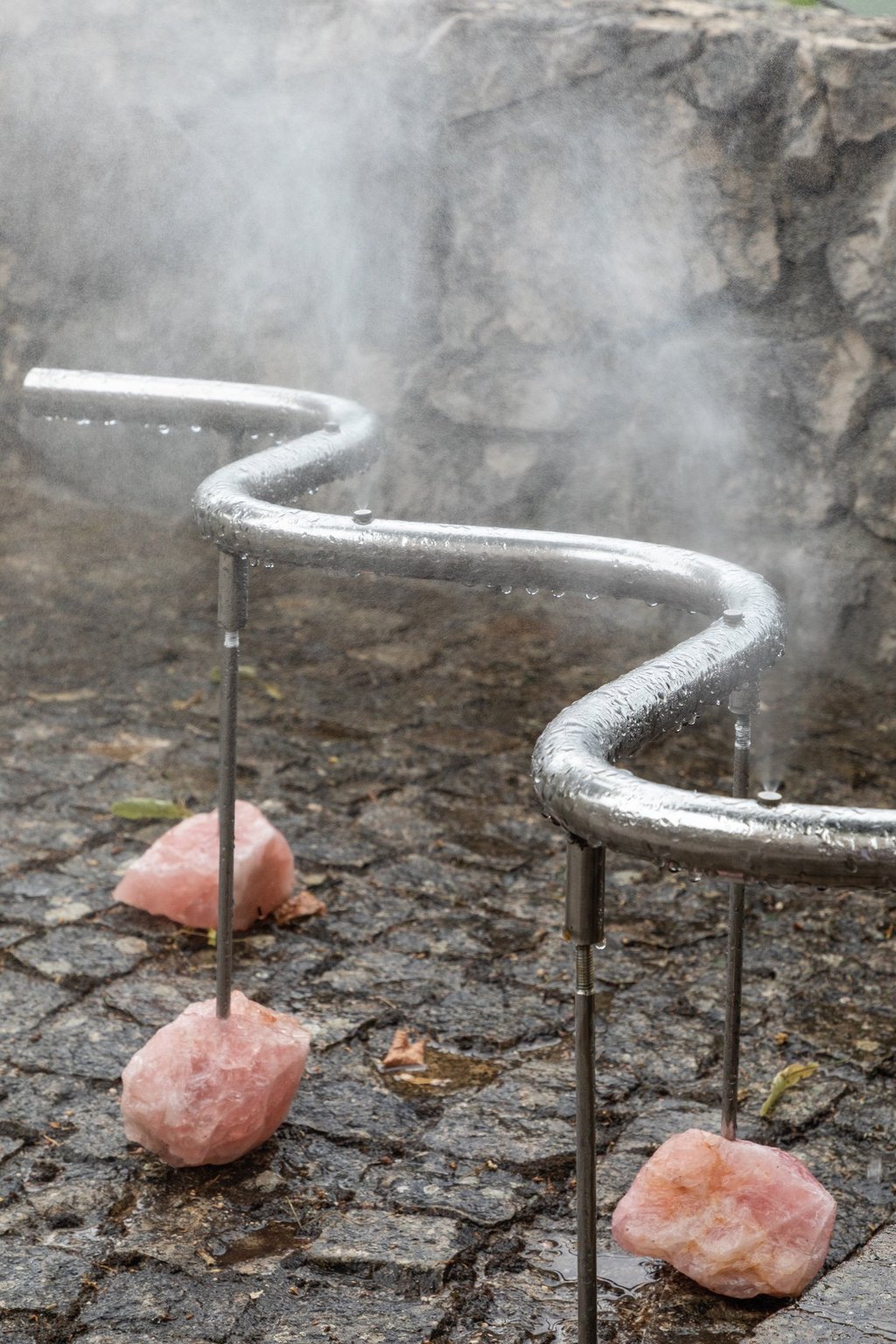 The sculpture comes to life once the mist system is tuned on and explores the intangible, the immaterial with water mist becoming the main element of the piece. Once wet, the colour of the pink quartz slightly changes into a darker and more intense pink. Water drops cover the body of Mist-y as the sculpture slightly trembles from the water pressure. When in contact with rays of sunlight a rainbow can be observed.