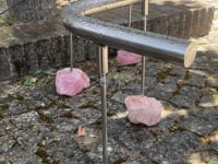 Mist-y creature (name originates from “mist” and from “mystery”) is a squiggly creature that produces fine water mist. It’s body is made out of solid stainless steel rods, bended and curved to create space for the water tubes hidden underneath. It has 5 rose quartz legs. The height of its legs can be slightly regulated as to ensure the levelling of the object.