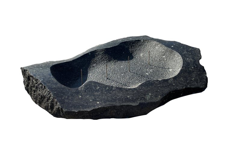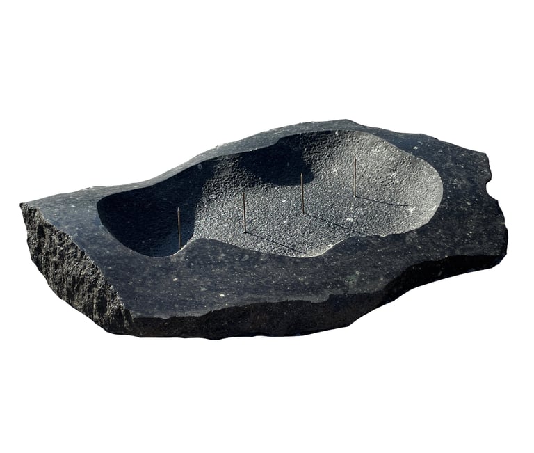 A Sculpted candelabra/vase from granite (Rhyolite) stone that can be filled with water. The objects invites for peaceful contemplation and meditation. A single block of granite has been carved in an organic shape to be filled up with water.