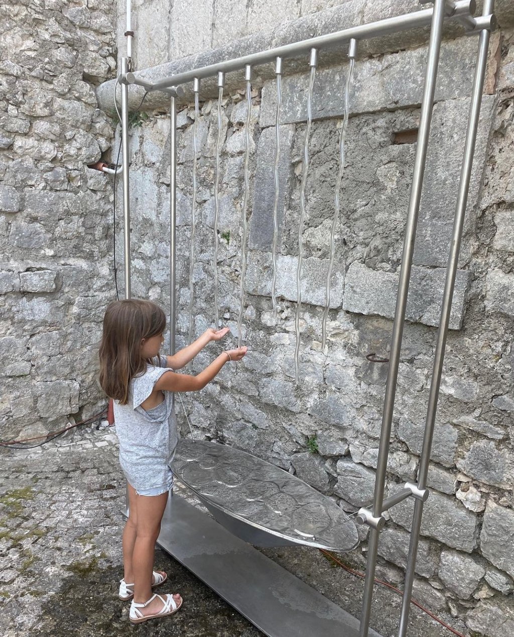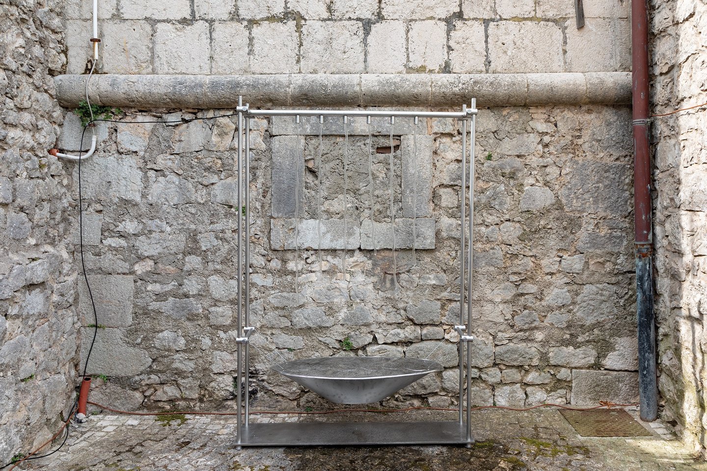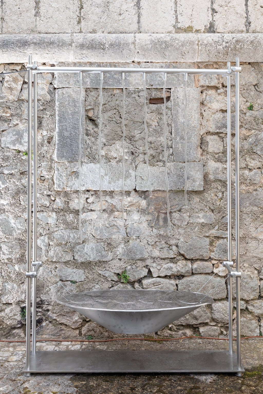 Soundscape / Paesaggio Sonoro is a sound sculpture where water drops slide upon wave-shaped solid glass rods, each with a different length. By hitting a formed metal surface each water drop creates a different sound. The melody created is ever changing and the piece becomes a musical instrument once a human places their palm to collect the water drops and by this to alter the melody.