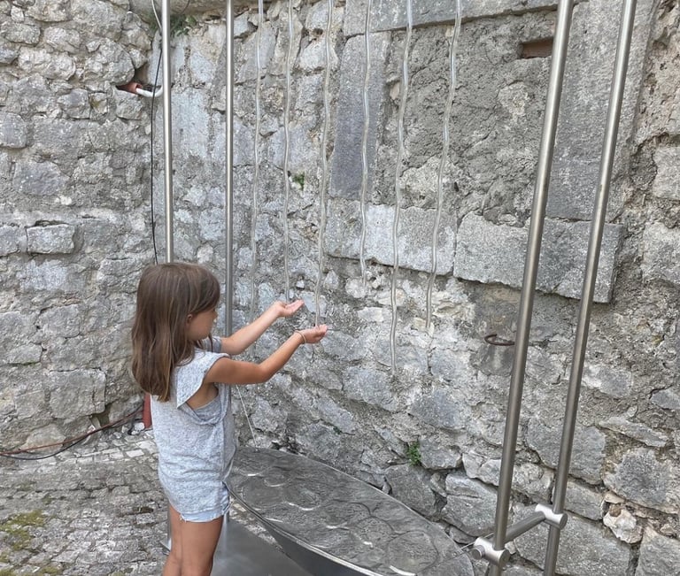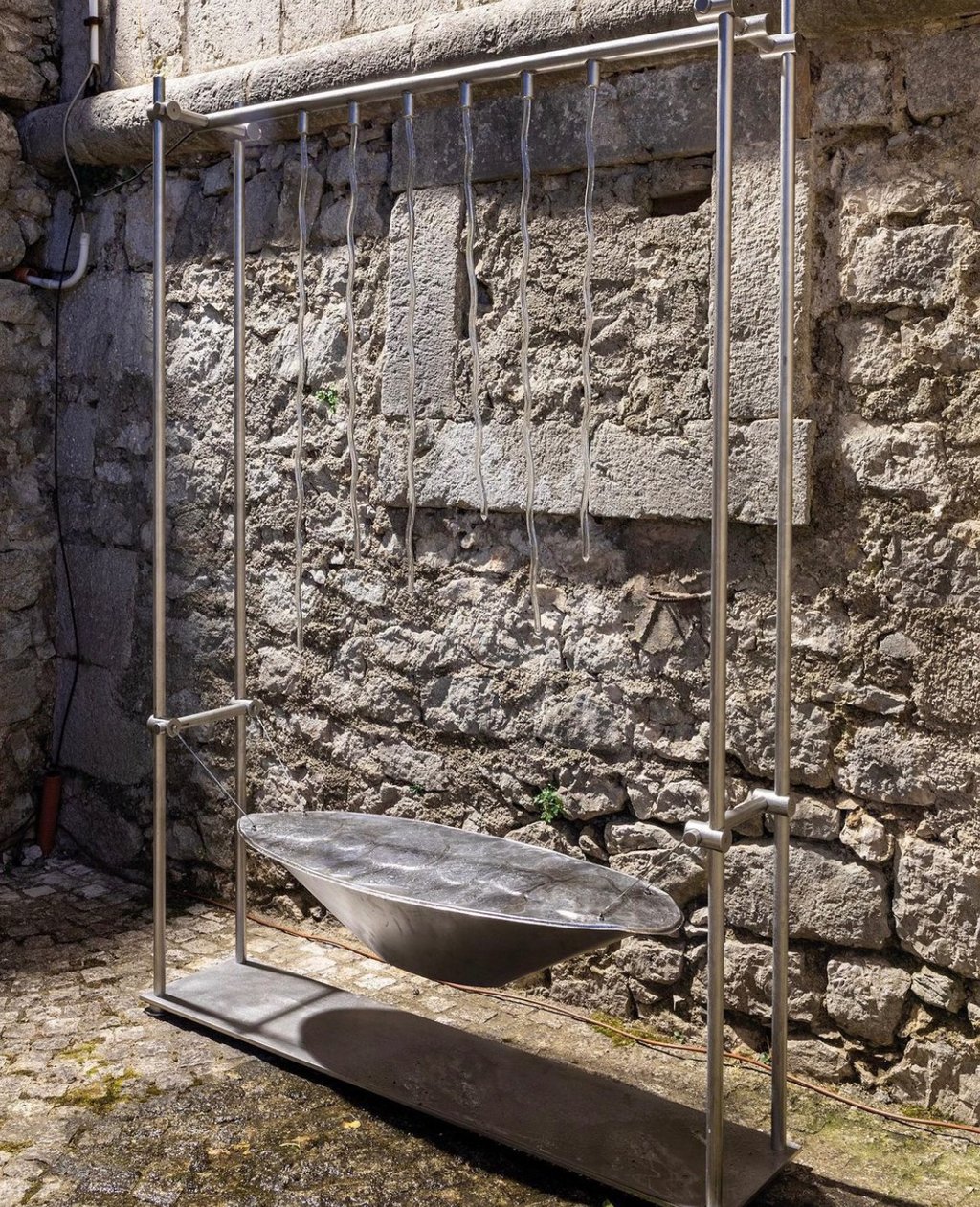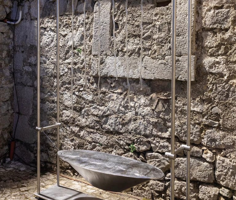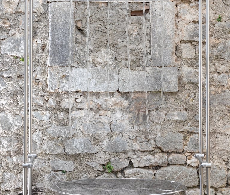 Soundscape / Paesaggio Sonoro is a sound sculpture where water drops slide upon wave-shaped solid glass rods, each with a different length. By hitting a formed metal surface each water drop creates a different sound. The melody created is ever changing and the piece becomes a musical instrument once a human places their palm to collect the water drops and by this to alter the melody.