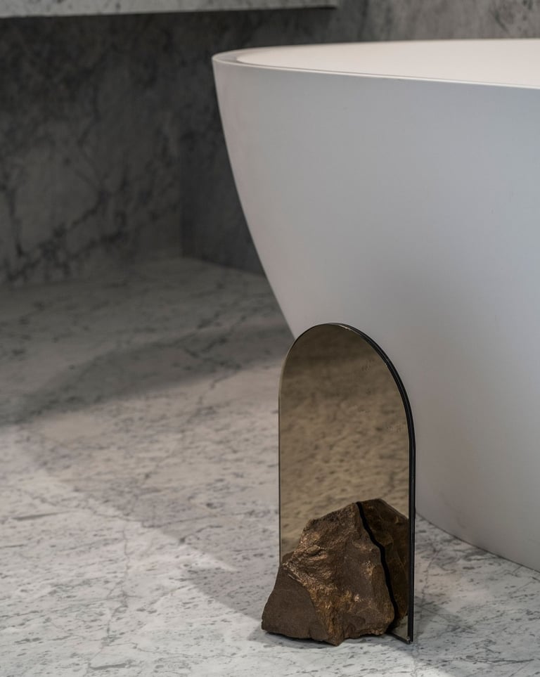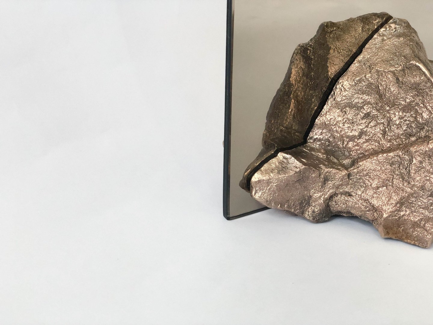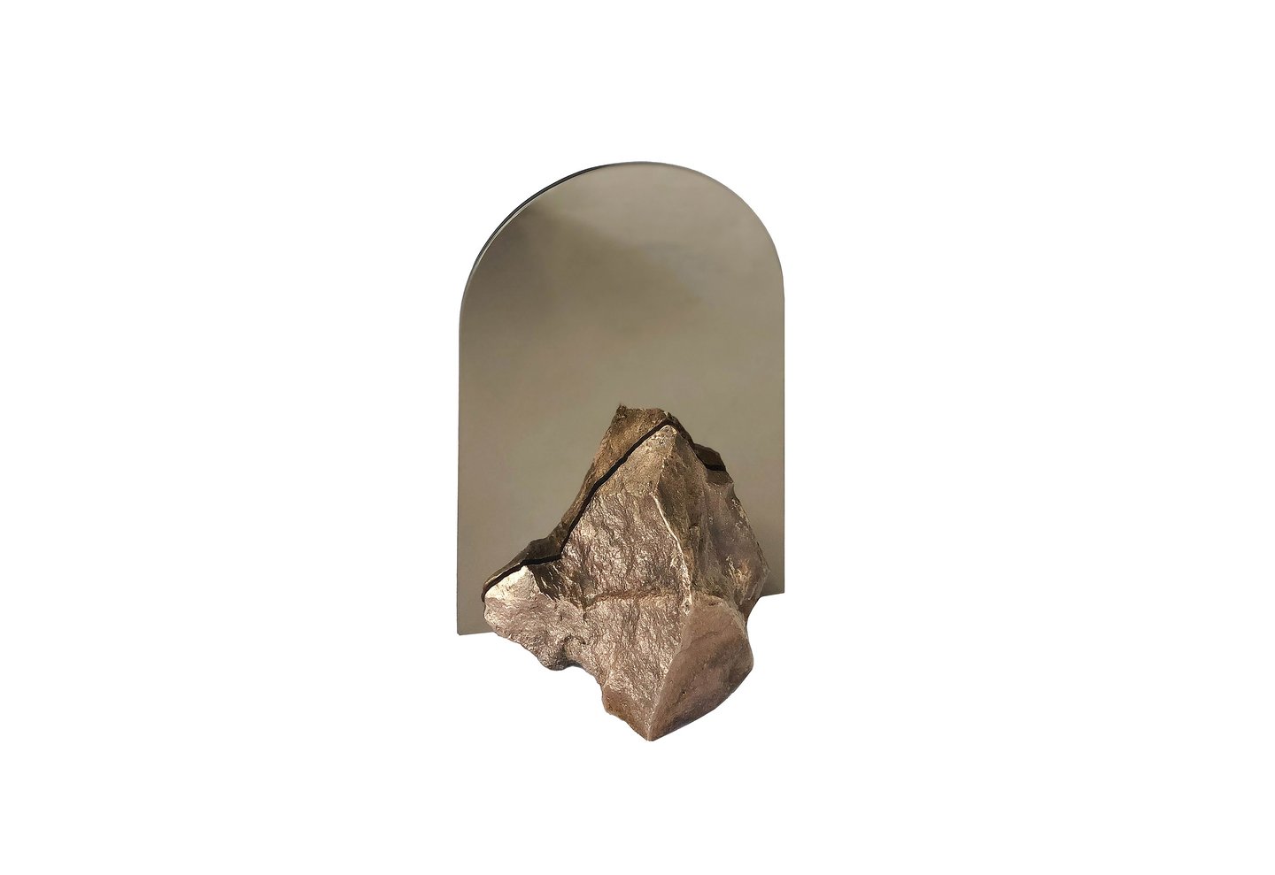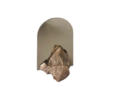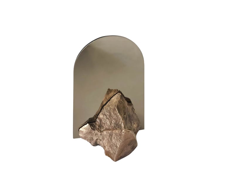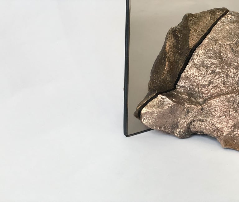 Stone Mirror explores our connection with nature and how our perception of mundane objects (such as found stones) changes if they are made from a material that is considered more valuable. I perceive stones as jewels found in nature, as something that carries its own enchantment and energy. The use of the double sided mirror creates a double reflection of the two pieces of the stones that are holding it together. What is real and what is reflected?