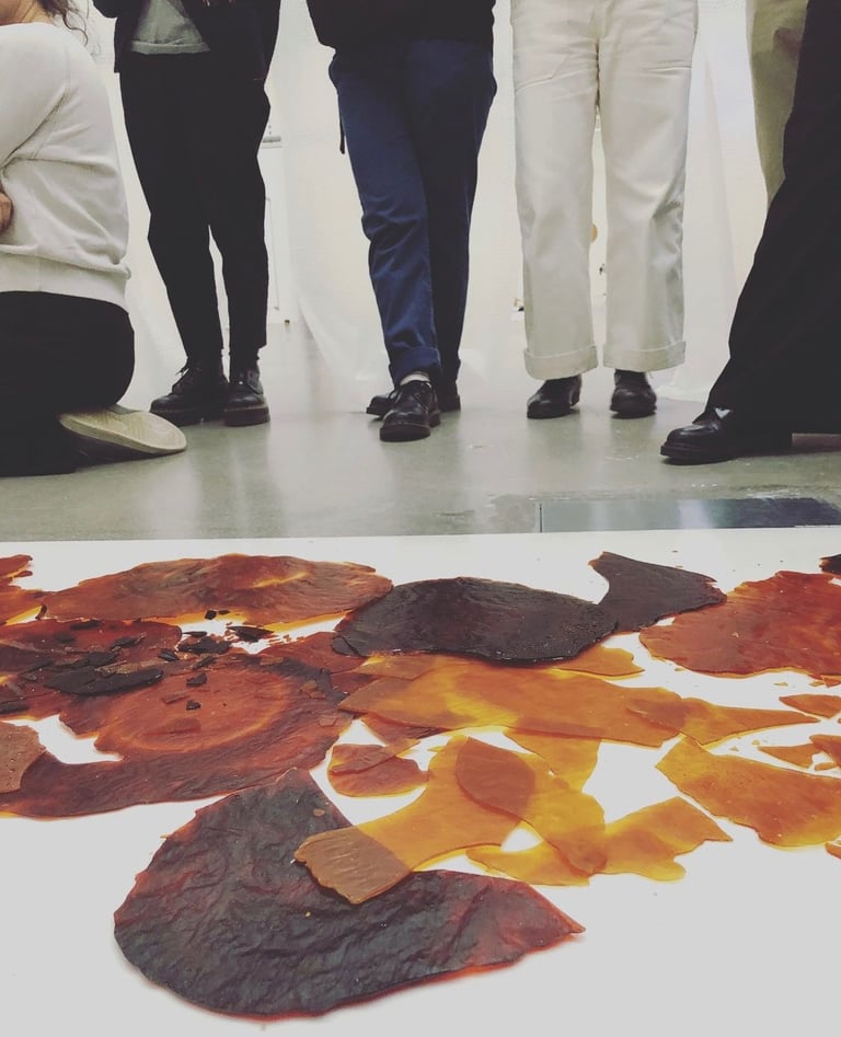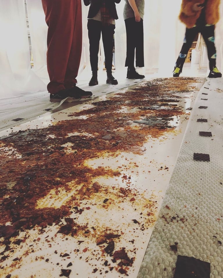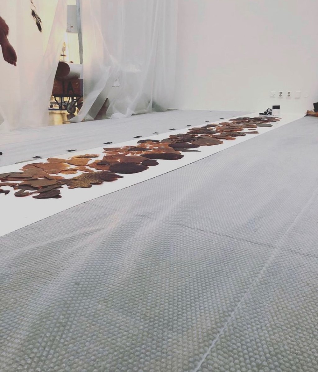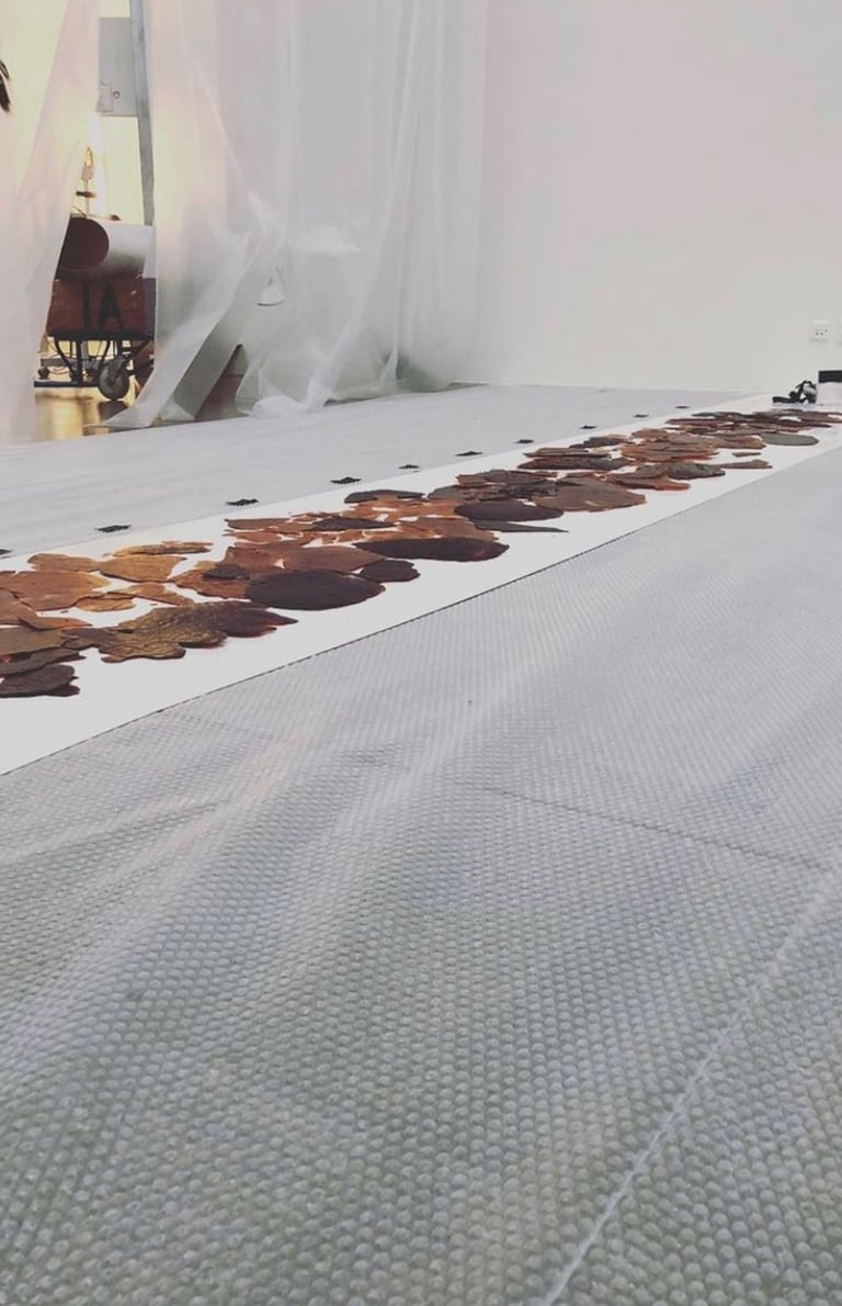 The created installation was with intention, the material choice decision came as a last element. The night before the performance I had a childhood memory of my grandma melting sugar on a frying pan for me and my little cousin. These simple caramels was a treat we loved. I wanted to bring back this nostalgia for the past and mentally transport visitors to their own childhood memories.